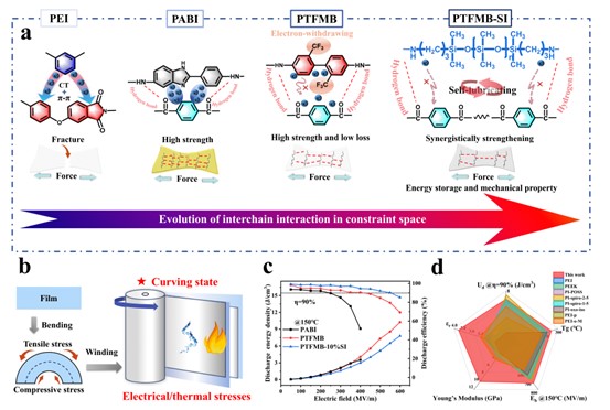 聚合物薄膜材料以其高充放电速率、高功率密度、高击穿强度、自愈性和加工性好等优点被广泛应用于静电电容器中。新能源汽车、光伏并网、油气勘探、航空航天等应用领域对聚合物薄膜在高温下(>150℃)的储能性能提出了更高的要求。双向拉伸聚丙烯(BOPP)是目前商用化应用最成功的电容器薄膜材料之一,但其高温下将出现明显的导电损耗,且能量密度和服役寿命急剧下降。因此,发展高温强电场下高储能、长寿命聚合物新材料是未来储能领域研究发展的重点之一。目前研究较为广泛的耐高温储能聚合物薄膜主要包括聚酰亚胺、聚脲、聚醚醚酮、聚苯硫醚和聚碳酸酯等。