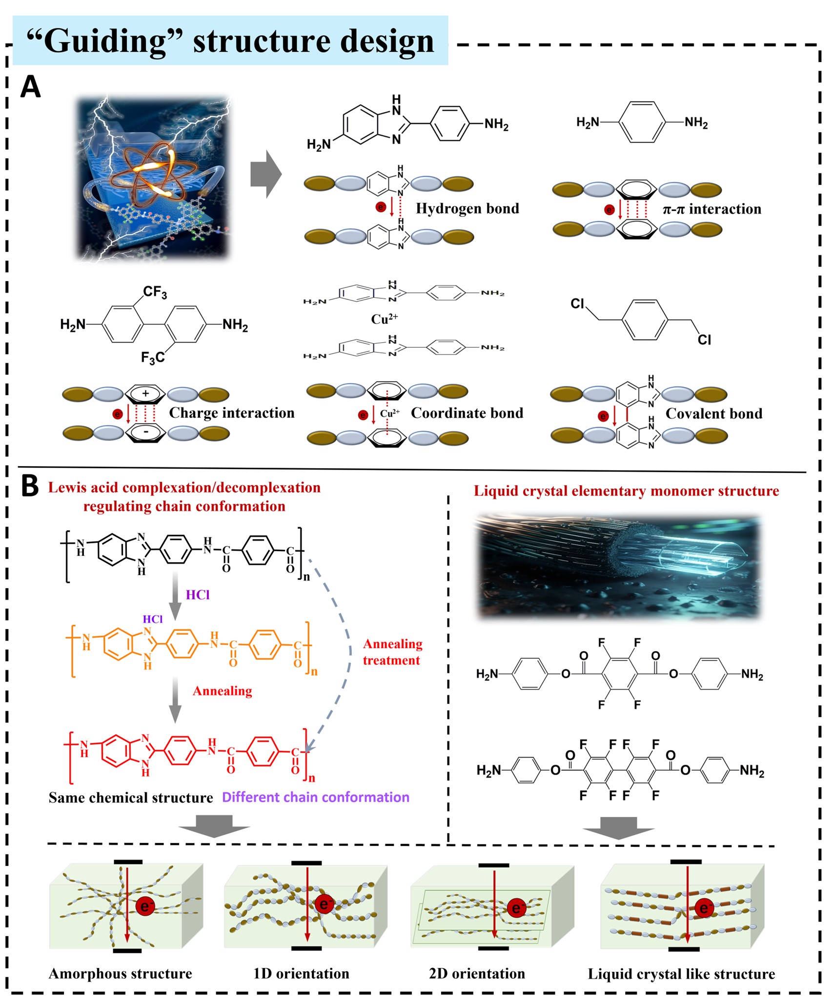 团队具体采用分子工程策略并通过模拟计算预测,将聚酰亚胺(PI)的“二酐–二胺”骨架重构为“二酰氯–含氟二胺”型杂环芳纶(PTFMB)。模拟及实验结果表明,PTFMB中存在的强氢键网络显著提升了力学性能,同时扭曲联苯结构与三氟甲基共同破坏了分子链长程共轭、拓宽能隙并减弱电子激发(图1)。进一步结合Lewis酸“络合–解络合”策略与高温辅助诱导链段紧密堆积,实现了材料的高结晶度调控。成功合成出一种全有机结晶性杂环芳纶薄膜(PTFMB),协同了机械性能和高温储能性能,为破解上述性能互斥难题提供了全新的解决方案。