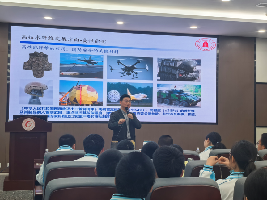 学院高分子材料系姜猛进教授带来“高技术纤维的发展与应用”科普讲座。他深入剖析我国化学纤维发展现状,阐述高技术纤维高性能化与超细化发展方向。为让学生直观感受,姜教授展示了三种化学纤维实物,拓宽了同学们的科学视野。