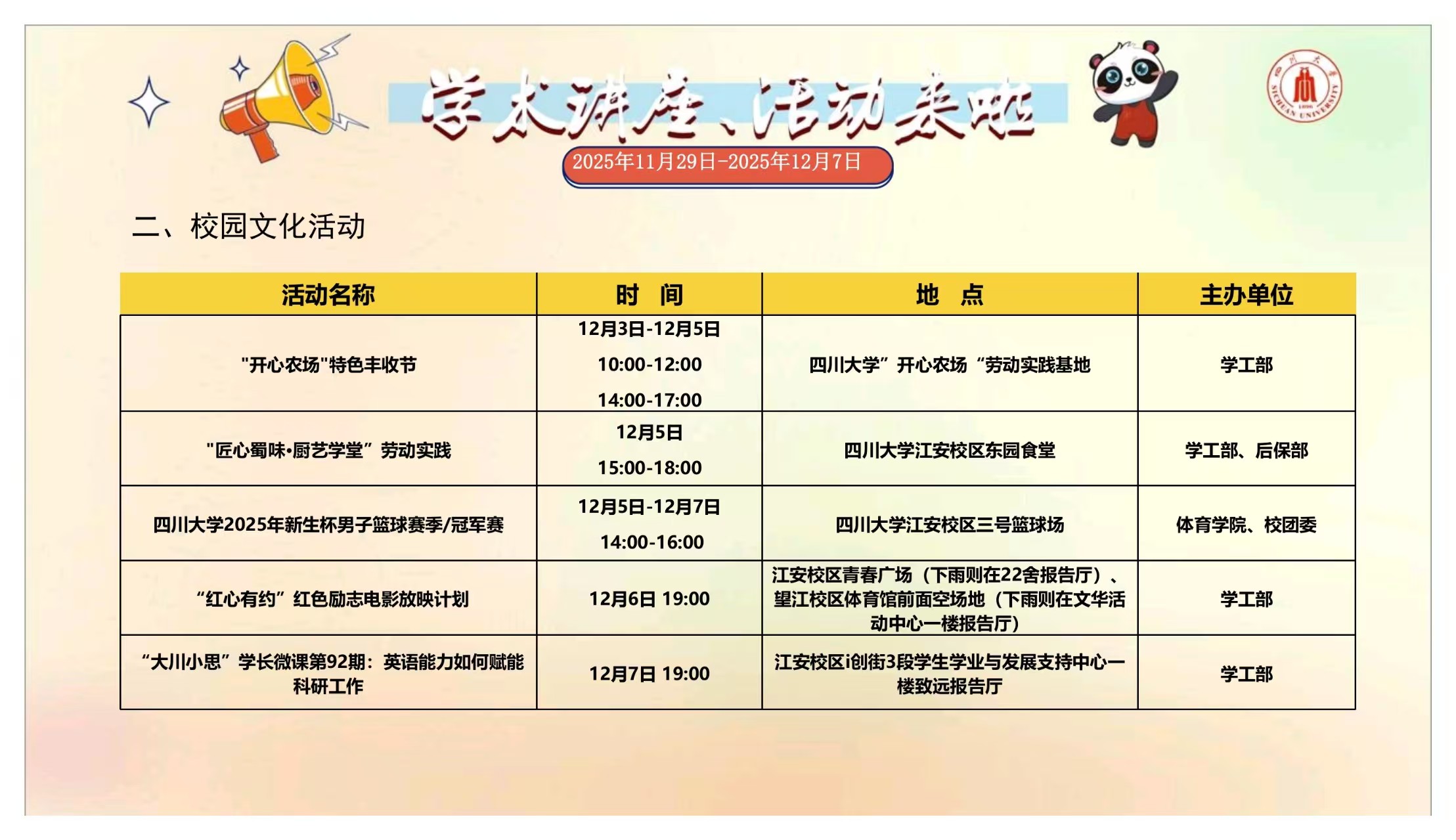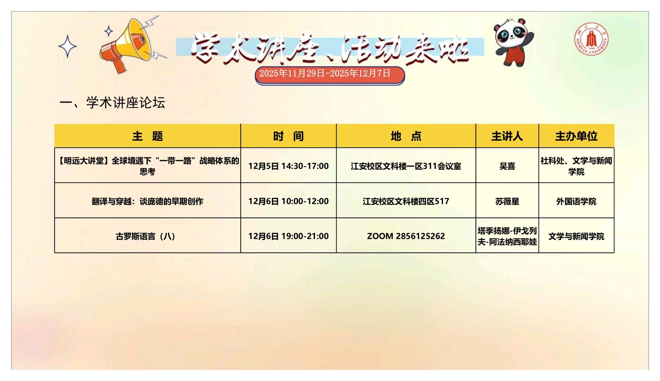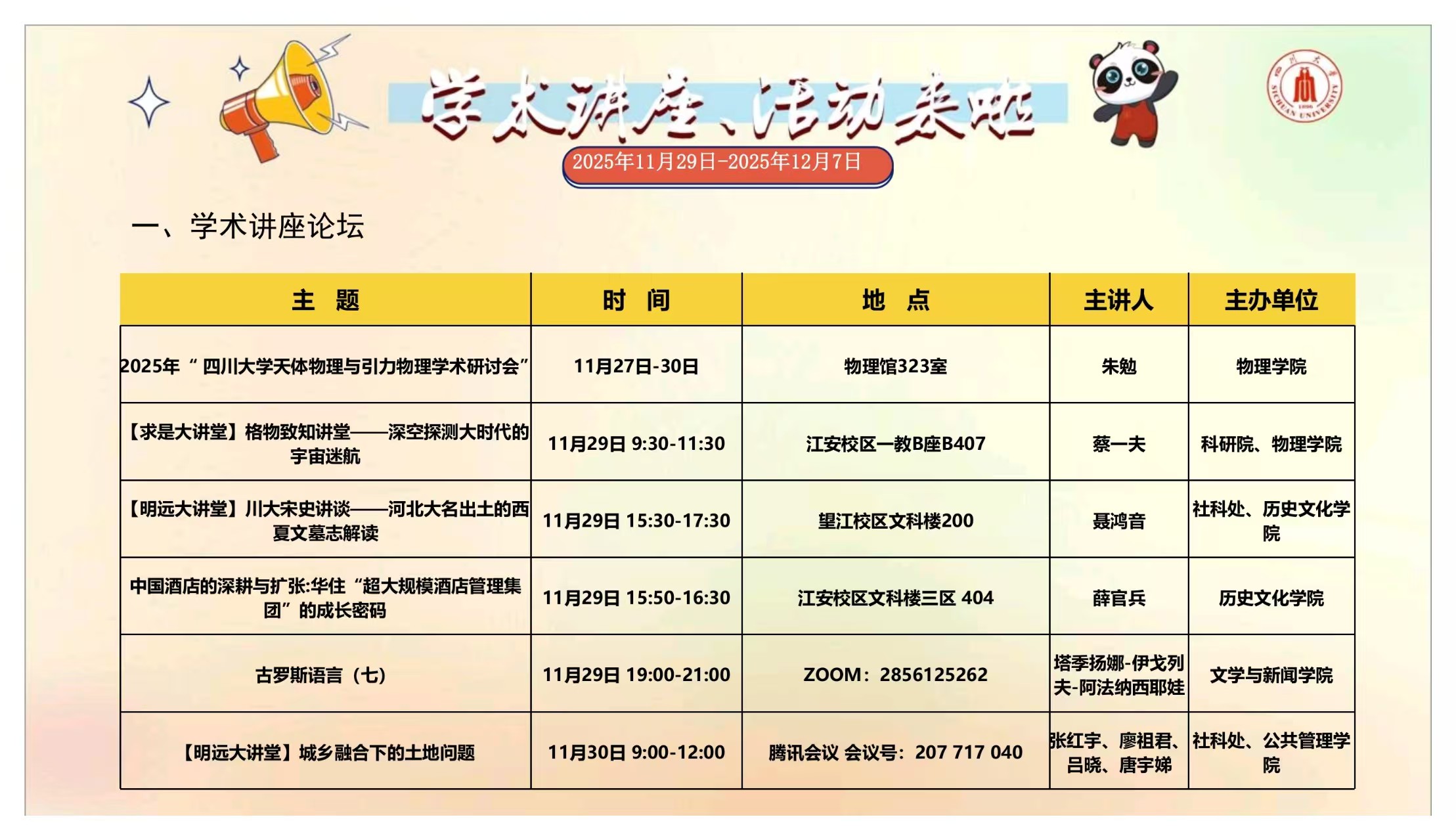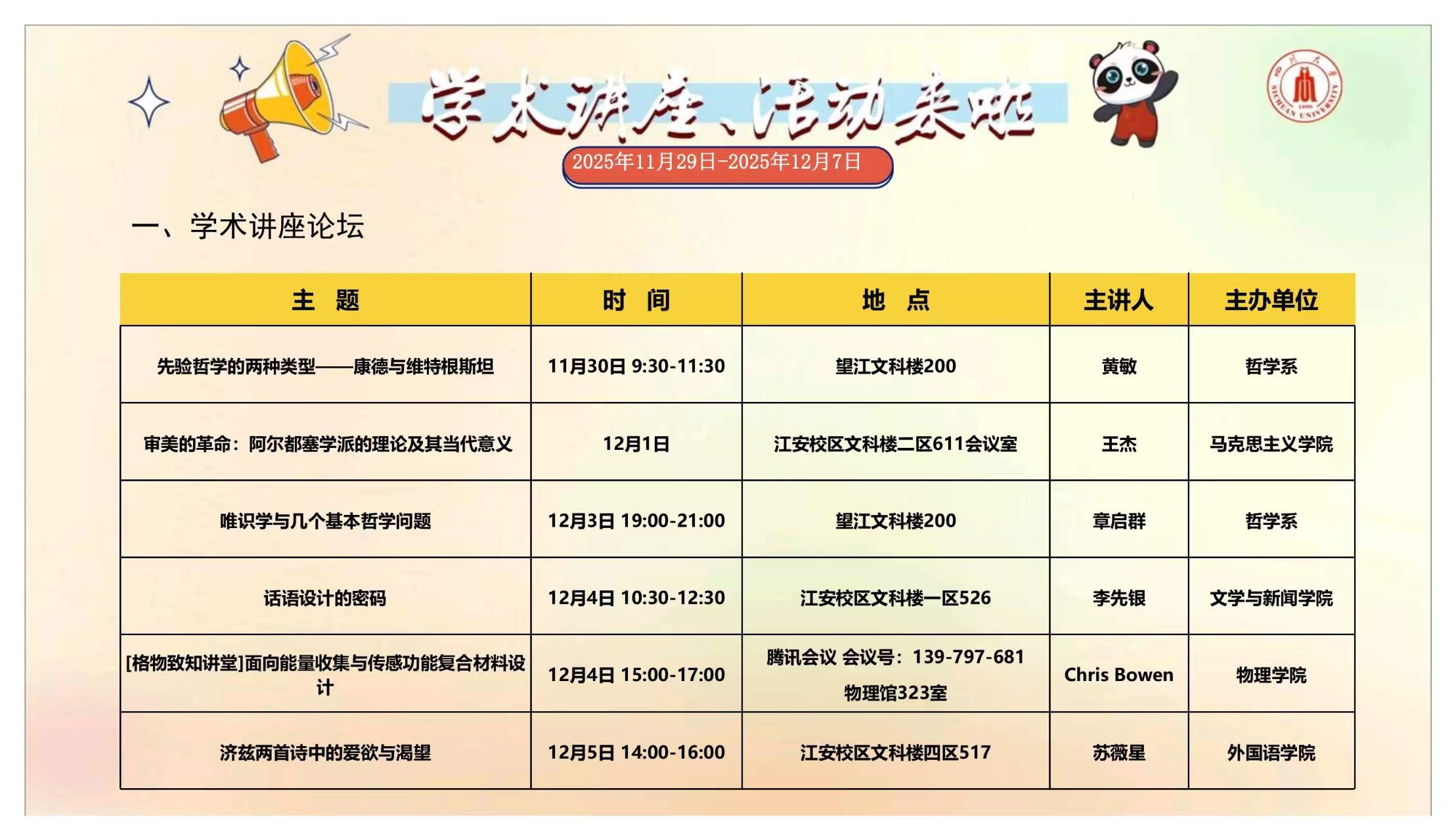 学术讲座和校园文化活动预告(2025年11月29日-2025年12月7日)